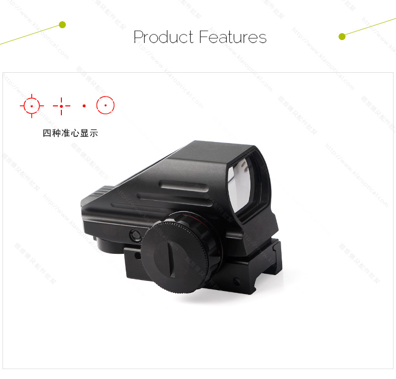 103瞄準鏡四變點內紅【產品名稱】:全息瞄準器【產品特點】:內紅綠點隱形 【產品型號】:103A【產品倍數】:1倍【產品口徑】:22mm【產品夾具】:20mm【是否帶燈】:紅綠光