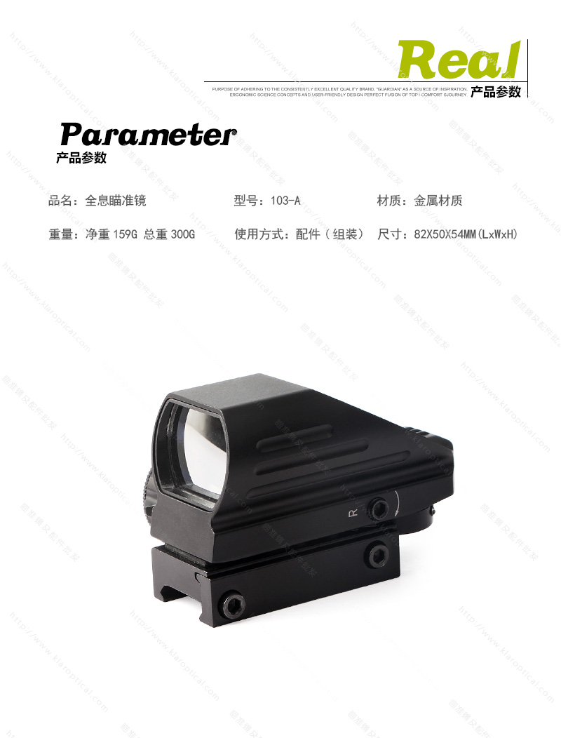 【產品名稱】:全息瞄準器 【產品特點】:內紅綠點隱形 【產品型號】:103A 【產品倍數】:1倍 【產品口徑】:22mm 【產品夾具】:20mm 【是否帶燈】:紅綠光【產品尺寸】:7CM左右 【產品材質】:鋁合金 【產品顏色】:黑色 【分化圖像】:四變點 【夾具選配】:11mm窄。20mm寬 103A全息瞄準鏡